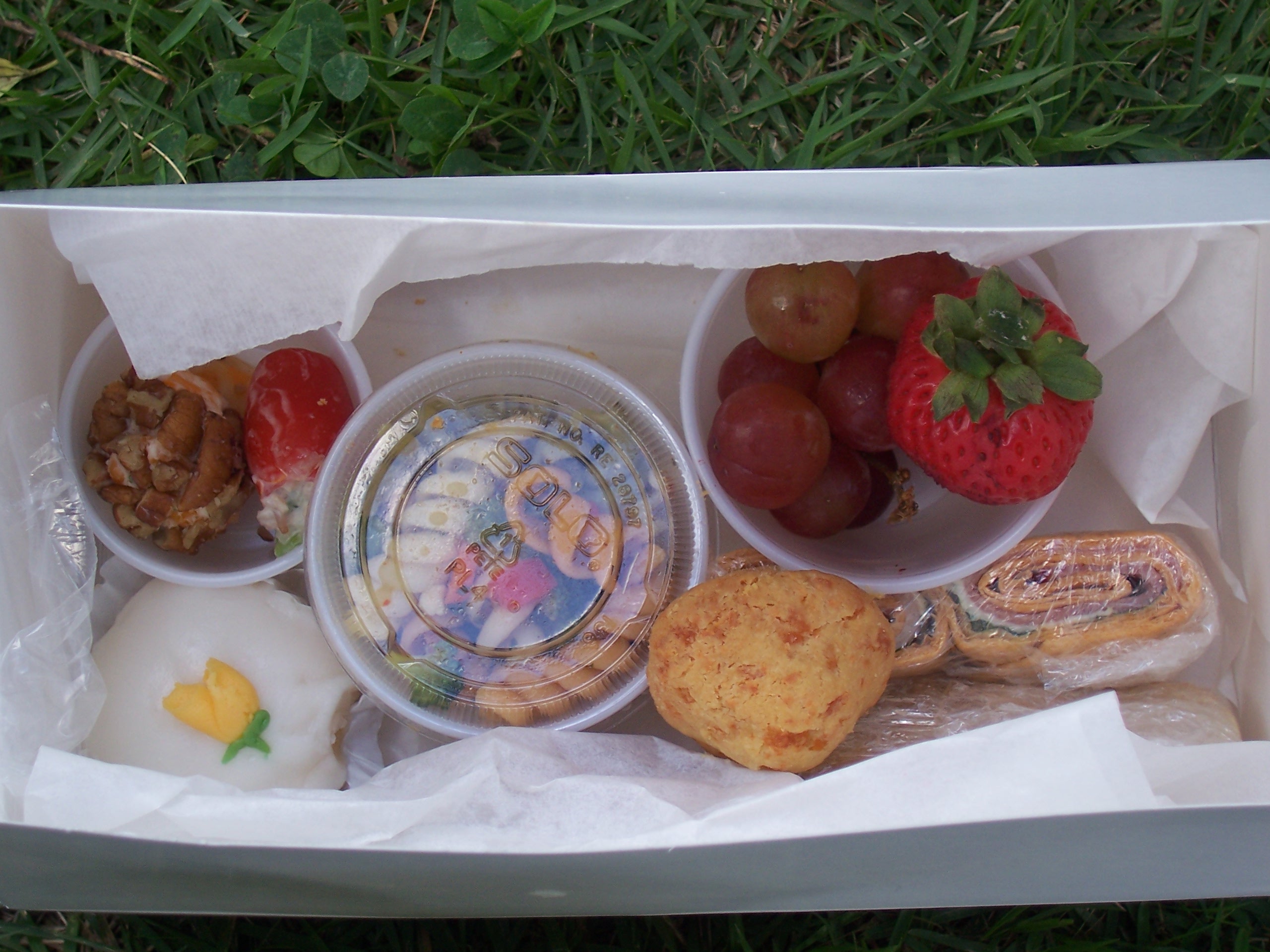 This was the yummy picnic we concert-goers got Thursday night at the outdoor performance Sounds at Sundown in Florence, Ala. Ensembles from the Shoals Symphony at UNA (University of North Alabama) performed in the backyard of the Rosenbaum House, the only structure in the state designed by Frank Lloyd Wright. And as good as the music was, you know food always gets my full attention. This tasted as good as it looked, and it’s exactly the way I like to eat: small bites of lots of different things. Here’s what was packed so elegantly into our beribboned boxes: Pasta and vegetable salad, crackers, fresh grapes and a lovely strawberry, stuffed olive (olives in a cheese-straw-like dough), two miniature round crustless sandwiches (with maybe