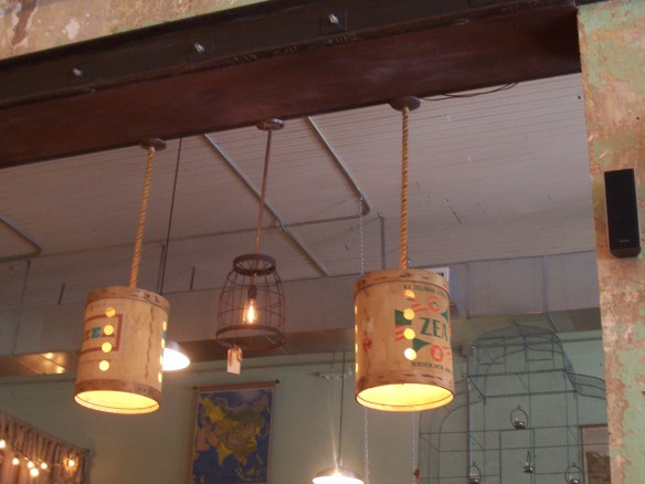 This past week I found these two examples of recycling — a past-its-prime Wise Man from a plastic outdoor Nativity set someone brought to the recycling center and these intriguing ceiling lamps that are part of the fun and funky decor at Urban Standard, one of my favorite coffee shops in Birmingham, Alabama. I’m not sure what the lamps were originally — some sort of barrel or crate for some kind of food? — but I am sure that I’d take one home in a minute. But the real mystery, of course, is about the lone Wise Man: I mean, what happened to the other ones? Are there two Wise Men sitting in somebody’s yard somewhere, trying to do the job of three? And why was this one deemed ready for recycling? His beard was a little spotty, but that was all my husband and I could find that might be wrong with him. Inquiring minds … And, no, we didn’t bring him home. We’ve rescued abandoned kitties, dogs, chairs and filing cabinets, but I draw the line at Wise Men.