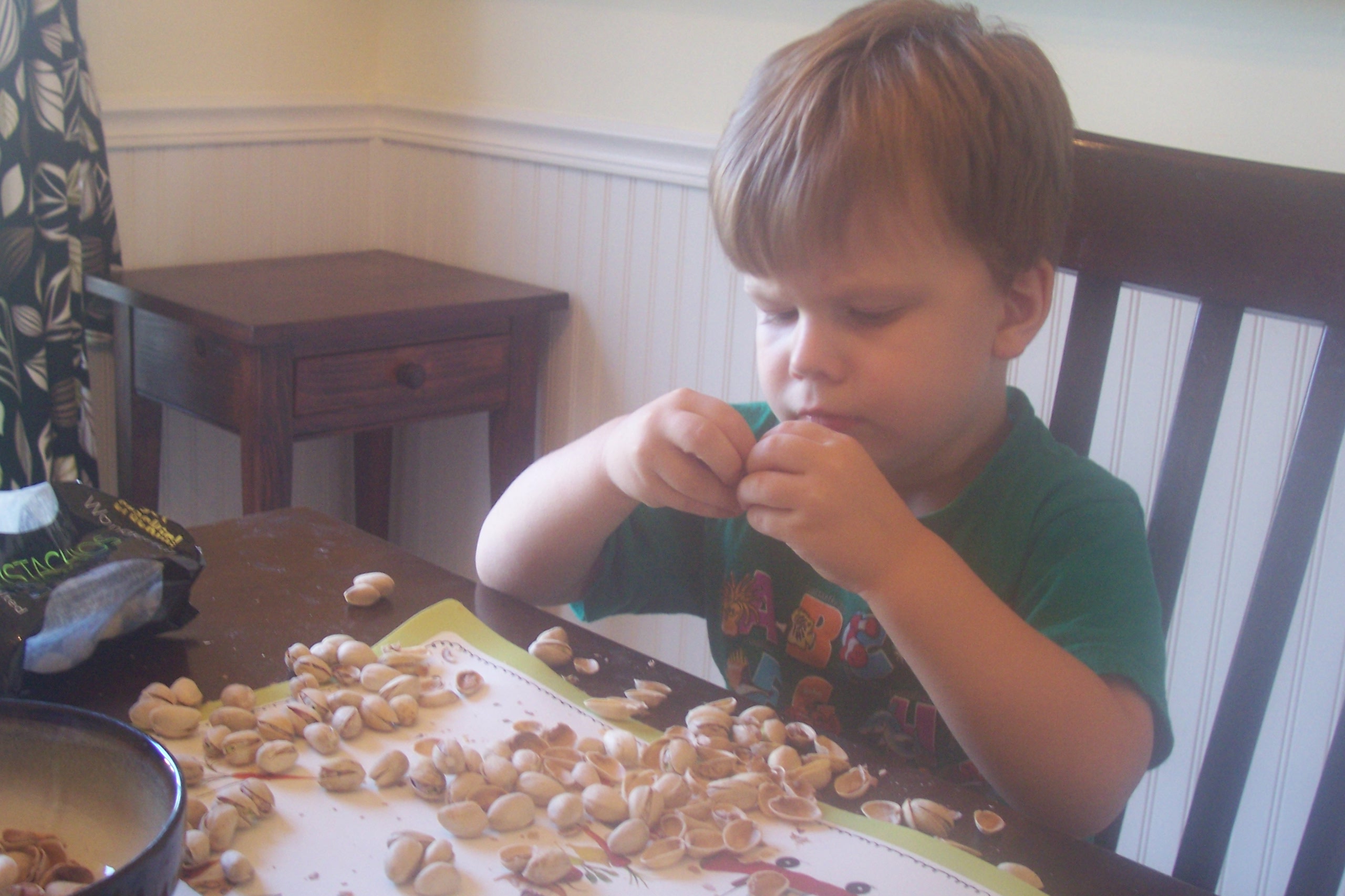 that’s what I was hoping when that’s the present I brought to their house recently because grandmas always bring presents. And it was a hit on all levels. First there’s the joy of bypassing the bowl Grandma Kacky conscientiously set out and simply dumping the whole bag on the table. Then there’s the careful consideration of each nut, carefully assessing its ease of crackability and gauging the likelihood for one or both halves and/or the nut itself to go flying across the room when opened. When it comes to the cracking part, extreme concentration is required — and even sometimes requests for some help from above. Finally, there’s that lovely salty and green-nutty satisfying crunch that makes all that hard work worthwhile. Well … for the Captain, anyway. After going through about two-thirds of the bag, he hops down and is ready for the next adventure — building a pirate ship out of the couch cushions, maybe? — but I have to hurry and find the broom and other cleaning supplies before the Captain’s parents come home and find the huge mess we made so I can impress them with my grandmotherly housekeeping skills.