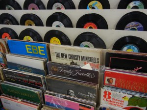 Christian charities — and your own sense of adventure. And by “adventure,” I mean “the thrill of hunting through racks of acid-washed mom jeans to find that one pair of perfectly fitting $200 J Brand marked at $3.99.” Wear comfortable shoes and clothes you don’t mind getting dusty and be prepared to spend hours. HOURS. And while it definitely is a bargain-shoppers’ paradise, your friendly America’s Thrift Store also houses historical items worthy of an admission price. Such as this collection of vinyl that, I think, is taken directly from my 1960s childhood. The New Christy Minstrels were my parents’ favorite and I still remember how carefully my mother would take the album from its cover and place it on the turntable, which was one of those that closed with a latch that made it look like a square suitcase. And the Firestone Christmas records! Classics! And what about 45s? I was in a multi-age meeting recently when talk turned to records and somebody mentioned 45s and one of the younger guys said, “Oh, you mean those are the little ones without the different bands on them?” We oldsters had to be revived after that. I so remember saving my babysitting money and then walking across the highway from our house to the local record store when the new shipment of 45s came in on Saturdays. Good times, good times …