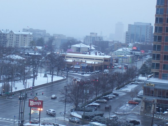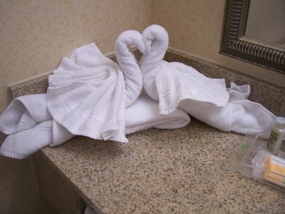 three cars waiting at a stop light says “traffic jam” to me. The biggest building I can see from my front porch is the three-story county courthouse on the square a couple of blocks away. Also: I’m lazy and do not like housework. If we even have clean towels in our bathrooms at home, I consider that quite an accomplishment. But at the same time, I love visiting Big Cities and staying in nice hotels. For a change of pace, you know. And for endless clean towels. So when those clean towels come origami-fied as a pair of swans, it’s lagniappe. I mean, is this something I should consider doing at home? And where did this idea come from? Did somebody sitting around a corporate hotel-chain table suddenly jump up and say, “Swans! We must have swans!”? Or is it a subversive effort from the housekeeping staff? Or maybe towel swans are The Latest Thing in hotels and I’ve missed it until now. At least it’s nice to have a cityscape balcony view to gaze at reflectively while you contemplate weighty swan-towel issues.