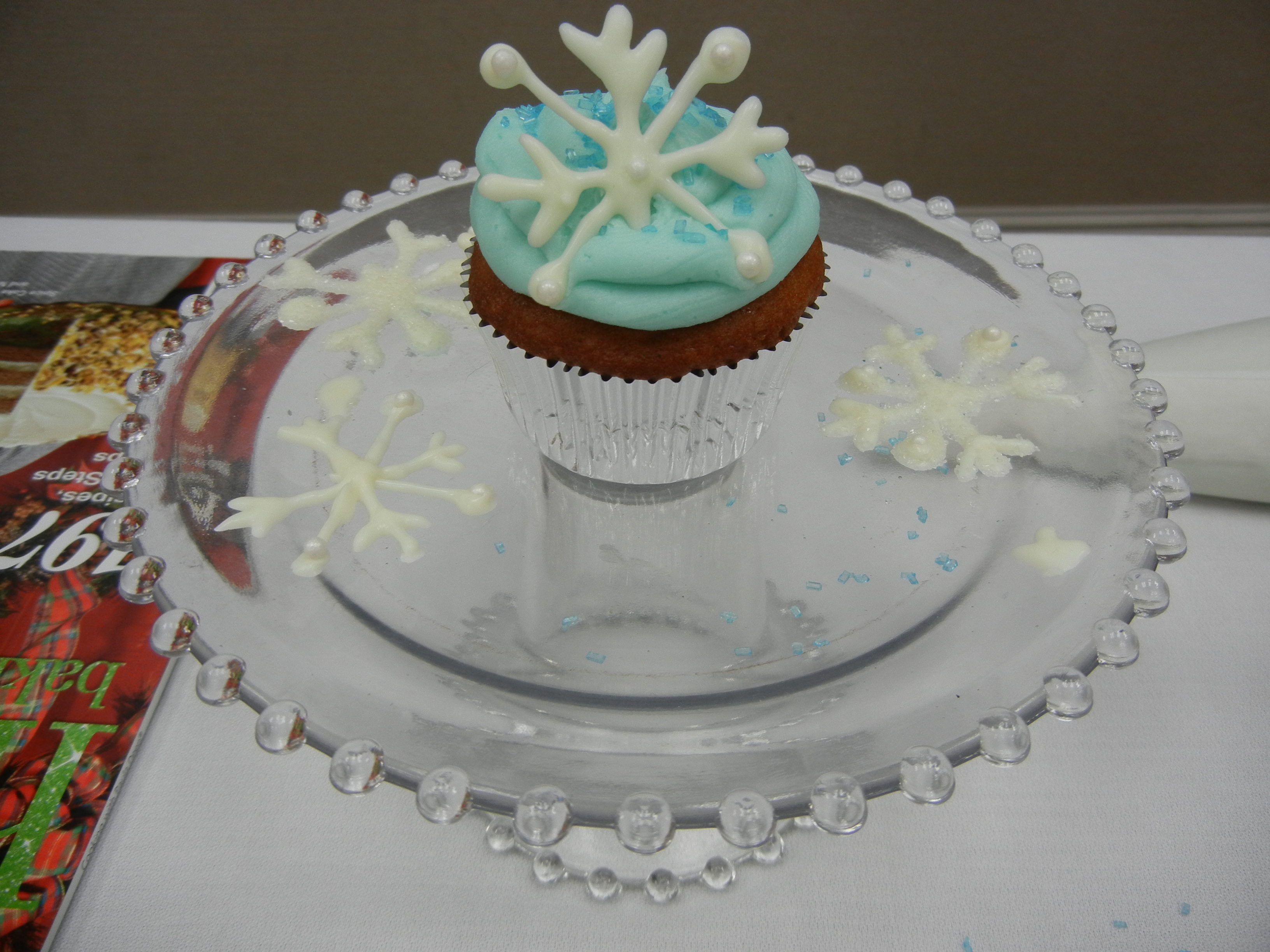 especially interest young adults. Created by two young women staffers, the series brings in local experts on such subjects as grilling, sewing pillows and pulling together your first Thanksgiving dinner. December’s program was “Christmas Cupcakes and Tablescapes” and it was so much fun. Decorating this season is bold & graphic and casual & eclectic — I was especially pleased to learn that since down-home imperfection is hot and glossily meticulousness is out, I now am apparently completely on trend — so creating decor using what’s within reach is both stylish and smart. Take the tablescapes. I’ve never considered using flat king sheets as table linens, but what a super idea that is. Add brown craft paper for a kid-friendly table runner, place cards for a thoughtful touch and a centerpiece featuring old glass jars with unpopped popcorn anchoring backyard-branches and you’ve got a simple yet eye-catching design. And, here’s breaking news from the cupcake front: The latest thing is to leave a border of unfrosted cake to enhance that imperfect undecorated feel. I think I’ll need to do more research on this and report back. In the meantime, make your own edible snowflakes by drawing patterns on parchment paper, melting candy-making wafers in a plastic squeeze bottle and then piping along your pattern. Adorable! Allmost tempts me to wander into the kitchen and pull out bowls and beaters and get to work. Almost …
