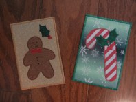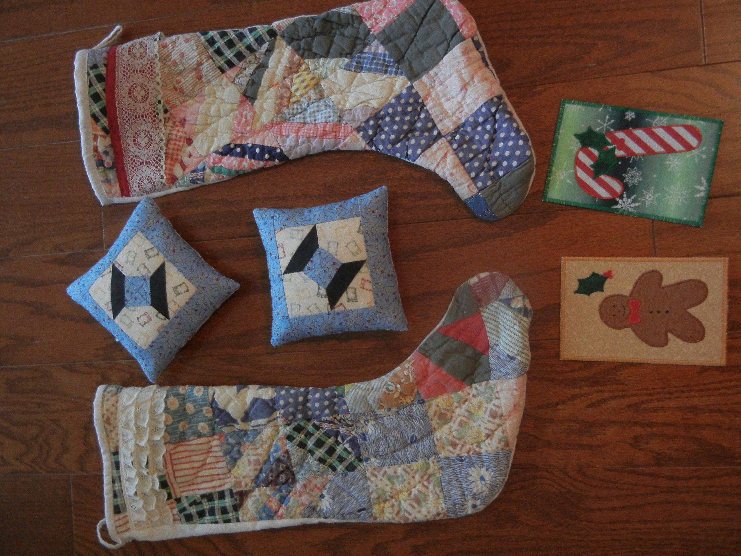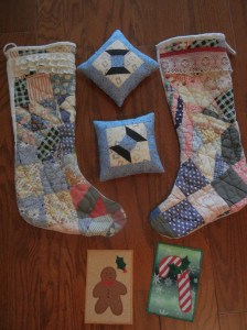 Thanksgiving and digging into Christmas only after you’ve got Turkey Day leftovers, I could not resist these hand-quilted holiday treasures I snapped up at a local craft show. These were made by members of the Corinth, Miss., quilting guild, and each piece is meticulously sewn with Southern style and creativity. I especially fell in love with the postcards. Yes! Hand-appliqued postcards you actually can send through the mail! What will they think of next??? I also loved the crazy-quilt stockings and the pieced pin cushions. I mean, I might even consider sitting down at my sewing machine if I had a cute pin cushion like this one. And then I might even Make Things. And I might even Make Things for Other People … See, this is exactly the sort of trouble you get in to when you start doing Christmas before Thanksgiving. I came awfully close there to talking myself into A Project. Not good. I should leave that to the folks who know what they’re doing — like the lovely ladies who created these holiday works of art.