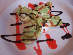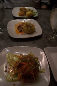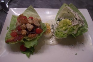 place “Tomato, Tomato,” we picked its upscale sibling Five Senses. Or, rather, JP picked it and I agreed. It was either Five Senses or Red Robin, and while I always enjoy working my way down a tower of fried onion rings, we made the correct decision here. We went with small plates instead of entrees and so started with three appetizers: fried oysters, Readyville Mill grits and a crabcake, all flavorful and with lovely sauces and little salads. Then Husband JP had a wedge salad, which he was delighted to see came in deconstructed form so he could play with his food, and I had a salad with fresh local lettuce. And then, dessert. Oh my oh my. Usually creme brulee is my go-to, but JP talked me out of it with a suggestion to try something new. Thank you, dear sweetie, because this trio of sorbets — pomegranate, mango and pink grapefruit on crispy lace cookies “glued” to the plate with homemade whipped cream — was absolutely divine. Every bite was cool, creamy, tart or sweet. And, honestly, to tell the truth, as much as I adore creme brulee and would eat it every day except that it’s like 10,000 calories per bite, the best part is the contrast of the crunchy sugar top with the smooth richness underneath. When that’s gone, it’s still good but bordering possibly on sameness. However, every bite of this sorbet — every single bite — was an adventure. As it always is when I go out with my husband.