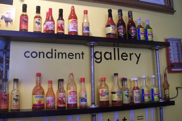 think we can all agree that good hot dogs are a rare breed. So when a restaurant proclaims that it serves a Good Dog right in its name, that’s a challenge I’ve got to check out. Happily, I can report that Good Dog, in the hip and happening area of Northshore in Chattanooga, Tennessee, does indeed serve a good dog. A fantastically wonderful hot dog, in fact. And I went for the veggie dog, too — and would rank it right up there with some of the best I’ve ever had. Probably because it’s cooked on the same grill right next to the beef dogs, but oh well. It’s the effort that counts. The menu boasts several versions of classic hot dogs (Chicago, New York Street Cart, Cleveland Ballpark) or you can order a plain dog and add whatever toppings you want. Ordering at Good Dog moves fast — there’s almost always a line — so know what you want before it’s your turn or you risk the wrath of everybody behind you. Due to the owner’s Dutch heritage, Heineken is the beer of choice here. And definitely go for the handmade frites, which are served hot and salty in a paper cone you then slip into circles that have been cut in your table. Good Dog is a condiment lover’s dream, as you can see from the photo, which shows only half of the condiment-gallery shelves. Also: When you order the frites, actually say the word “frites” instead of “fries” so you’ll seem like a regular. You’re welcome.