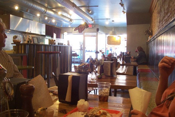 (they’re still peeved about that, you know) and the Great Locomotive Chase. But now I’m adding this town to my list of food destinations, starting with the Marietta Diner, which is only a “diner” in the sense that people go there to eat. It’s a large, noisy, family-friendly, food-abundant destination. We went with friends during a recent wedding weekend in nearby Kennesaw. Don had been there before and suggested we try it, although he couldn’t really describe the place. “It’s big,” he said, helplessly. “There’s a lot of food.” I wish I’d listened to him before I ordered pan-fried feta cheese in lemon butter for the table as an appetizer, although it was so good that I’m not sorry at all. Then came soup. And salad. And squares of spinach pie. (I can’t spell “spanakopita.”) And bread. And THEN came the entrees you ordered oh-so-long-ago when you first thought you were hungry. (All this, I might add, while in sight of tempting cakes,