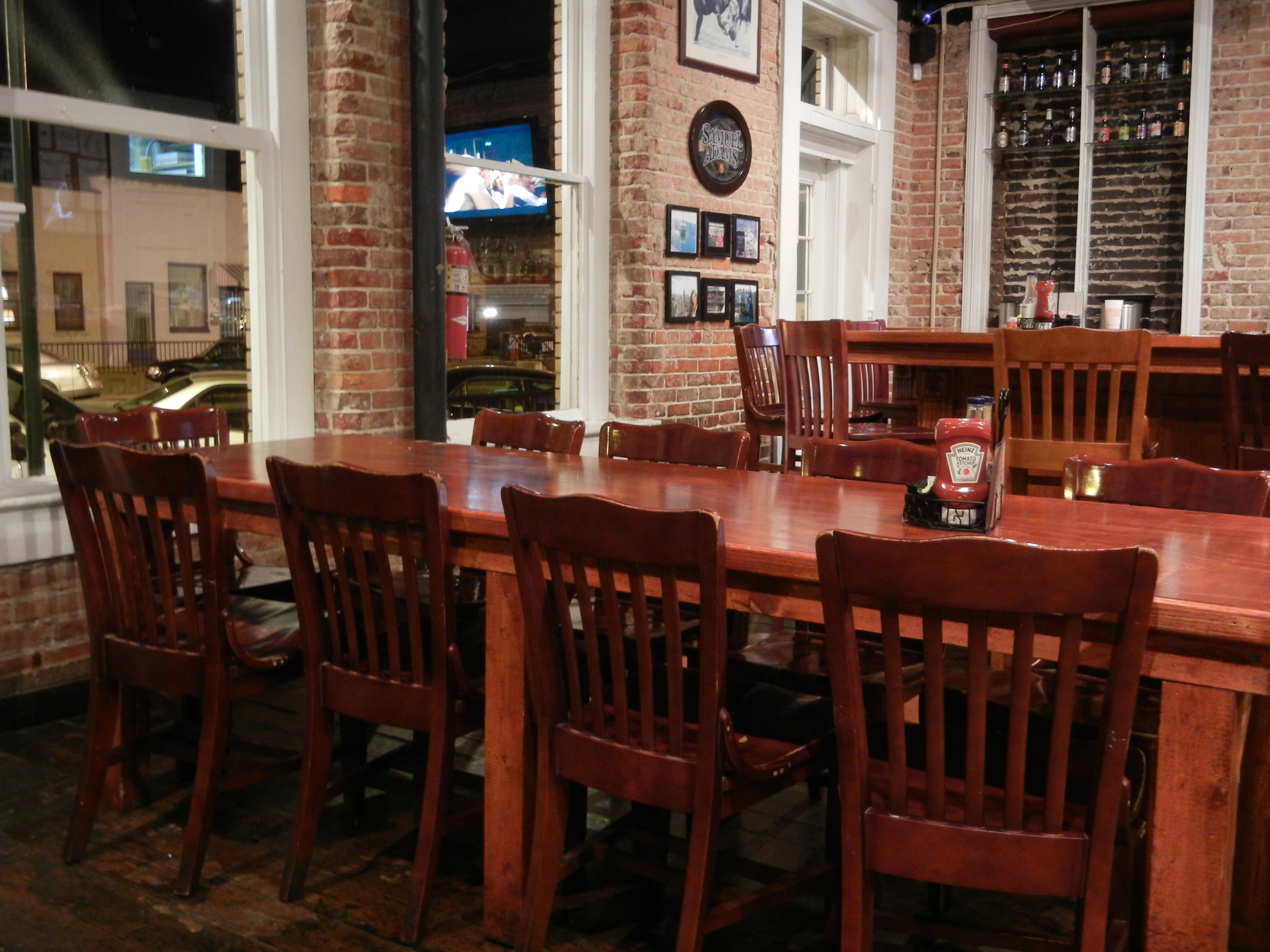 bulldogs and cowbells? For the best college-town experience — and some great beer and burgers — head to Mugshots Grill and Bar, in a restored brick house on a downtown historic-district corner. Husband JP and I headed here recently after a basketball game, based on several recommendations that all mentioned the good food and the iffy service. We agree on both counts. Love the decor and atmosphere — exposed brick, gorgeous woodwork, fireplaces and authentically worn floors. And then there’s the menu. You’ve got all the usual suspects, but with a twist. The fried cheese wedges are made of actual real cheese lightly breaded in maybe panko crumbs so you get more of a cheese flavor than a greasy taste. Sandwiches are on fresh-tasting sourdough buns and come with crunchy and potato-y beer-battered fries. (Why is this the first time I’ve ever eaten beer-battered fries?) Burgers come in all your favorite variations: blue cheese, sauteed mushrooms, barbecue sauce, hickory-smoked bacon … and peanut butter. Yes, peanut butter. Stop laughing. I now will never eat a good real-meat grilled hamburger again without spreading on some rich and creamy peanut butter and maybe some sweet berry-filled jam. Also, plenty of decent draft choices. Was all this worth waiting more than an hour for and listening to two — TWO! — stories of kitchen woes from our waitress to explain our missing food. Since the end result was beer-battered french fries and a peanut-buttered hamburger, the answer is “yes.”