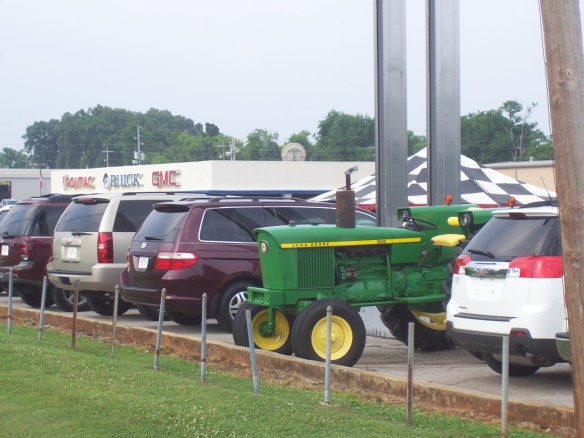 big fan of both. But surely your first thought when you saw the furniture photo was “Hot,” too. Right? Please??? A little help here??? And in more drive-by double-takes, my Dear Husband was the one who first spotted this John Deere tractor parked in the car lot of a dealership in Muscle Shoals, Alabama. “You’ve got to go take a picture of it,” he said. “I’ve never seen a tractor for sale at a car dealership.” So I checked it out, and he was right: The sight of a farm tractor parked in the midst of mini-vans for sale is a bit jarring. I mean, did somebody trade the tractor for a car? Would people wandering through the lot looking at the latest sedan models suddenly decide they wanted a tractor instead? Or maybe are tractors now the new family vehicle and we’re at the beginning of a surprising new trend? I’ll keep you posted. In any case, I love living someplace where cars and tractors happily co-exist.