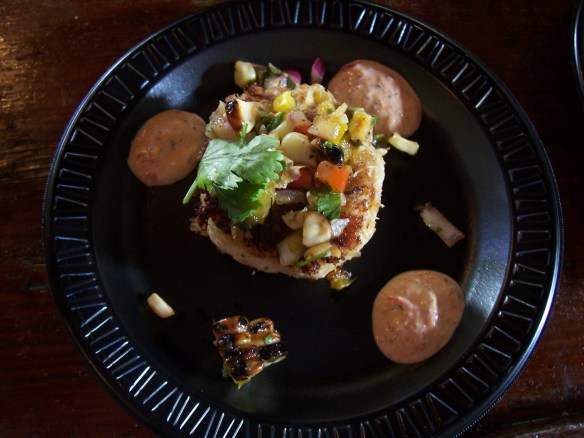 driven down to Pensacola, Florida for the annual Crab Cake Cook-off. The food frenzy and fundraiser at Seville Quarter — a block of restaurants and bars in downtown Pensacola — benefits ARC Gateway, the local association that helps people with developmental disabilities. Our son-in-law is the one who found the cook-off three years ago during a family beach vacation, so Husband blames him for our annual addiction. But can you blame us? I mean, you get to help a worthy cause AND eat all the crab cakes you want. Let me say that again: All. The. Crab cakes. You. Want. I mean, you get to sample crab cakes from about 20 local restaurants and caterers. I’m only sad that it’s only once a year. I absolutely love having so many different crab cake recipes and techniques all in one place. And it’s such a diverse offering. You get everything from simple crab chunks with hardly anything masking the fresh crab flavor to artfully arranged plates featuring salsas and sauces. There are spicy crab cakes, sweet crab cakes, flat and crunchy ones, thick and soft ones — anything you can dream of, crab-cake-wise, you can find at the cook-off. Before we walked in this year, we agreed to learn from past mistakes and take it slow — perhaps sharing crab cakes instead of each of us having one from each vendor. I immediately dropped that plan, however, when faced with the treasure of unlimited crab cakes. Maybe next year … You can click here for cook-off results, here for info on ARC Gateway and here for more about Pensacola’s Seville Quarter. (Also, I wanted to show off that I finally figured out how to do links the correct way. Thank you!!!)