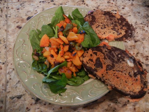 For a fall weekend lunch pulled together with NOTHING in the fridge, I’m pretty proud of this Roasted Butternut Salad. I found three almost-to-the-wrinkled-stage butternut squash(es?) sitting resignedly in the vegetable bin along with some almost-wilted spinach. Peeled and cut the squash and roasted it with a bit of olive oil and half an onion for about 35 minutes. Put it on the not-so-fresh spinach and added crispy cheese bread made from the lonely ends of a pumpernickel loaf and freshly grated parmesan (that, at least, was new and good). Sometimes, being too lazy to go to the grocery turns out to be a good thing.