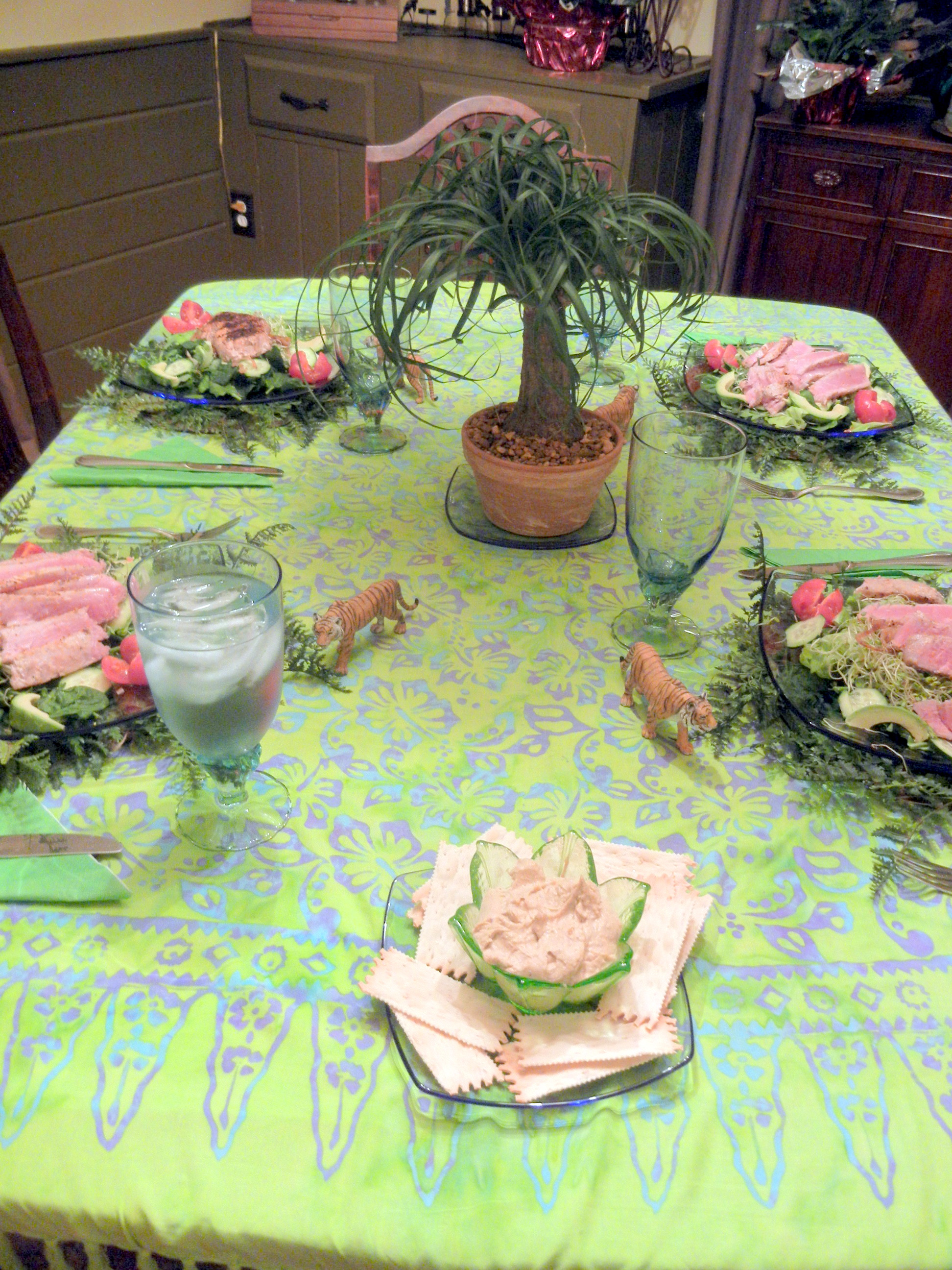 family who practically are oozing with creativity, so all I have to do is relax and enjoy. Take my four-woman book club. Three of our members prepare thoughtfully themed meals with fun decorations and appropriately chosen wine for our sort-of monthly meetings, and one of our members does not. Draw your own conclusions. Needless to say, book club was NOT at my house for our recent “Life of Pi” dinner and discussion. With her usual flair, our hostess went all green and tropical with the decor (loved the leafy chargers!) and served us delicious seared tuna, veering away from the book for a