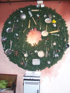 As a working factory, the building has housed Dortch Stove Works and Magic Chef, and The Factory pays tribute to those roots with touches such as vintage appliances, retro home decor and this oversized wreath decorated with kitchen essentials. (Note my suitcase-like green purse on the bench below for size comparison!)