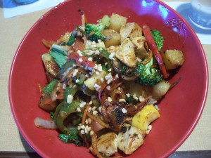 My Dear Husband is an adventurous eater but I could tell he wasn’t impressed when we first stepped in one of those Mongolian barbecue/grill places — too crowded, too many choices, too much work. I already had fallen in love with the concept of fill-your-bowl-and-let-somebody-cook-it-on-a-grill at the sadly now-defunct and much-mourned Fire and Ice in Birmingham, Alabama — and after his first taste, Husband joined the fan club, too. I mean, it’s like wandering through a