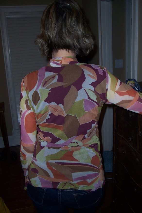morning. “Sweetie,” he said, “why are you wearing a camouflage shirt?” I didn’t think I’d heard him correctly. “A what?” I said. “I’m wearing a what?” He nodded his head as if to confirm his fashion diagnosis. “Yes. You’re wearing a camouflage shirt and I just wondered why.” I could not believe what I was hearing. “What’s wrong with you?” I said. “This is not a camouflage shirt. It’s an abstract floral pattern in earth tones — very ‘in’ for spring, I’ll have you know.” He just smiled. “Sure, dear,” he said. “Whatever you say. But it’s a camouflage shirt.” And, really, looking at these photos now, I can sort of see what he means. Just as long as y’all know it is not a camouflage shirt but it a highly stylish piece of fashion art. Or something. Also: I blame the neck wrinkles, tummy bulges and droopy boobs you see here on my husband’s photography and the fact that he would not let me do the half-turn hand-on-hip camera-friendly celebrity pose. And those are streaks of blonde in my hair, not streaks of gray. Other than that, though, this is pretty much me. Minus the camouflage shirt.
