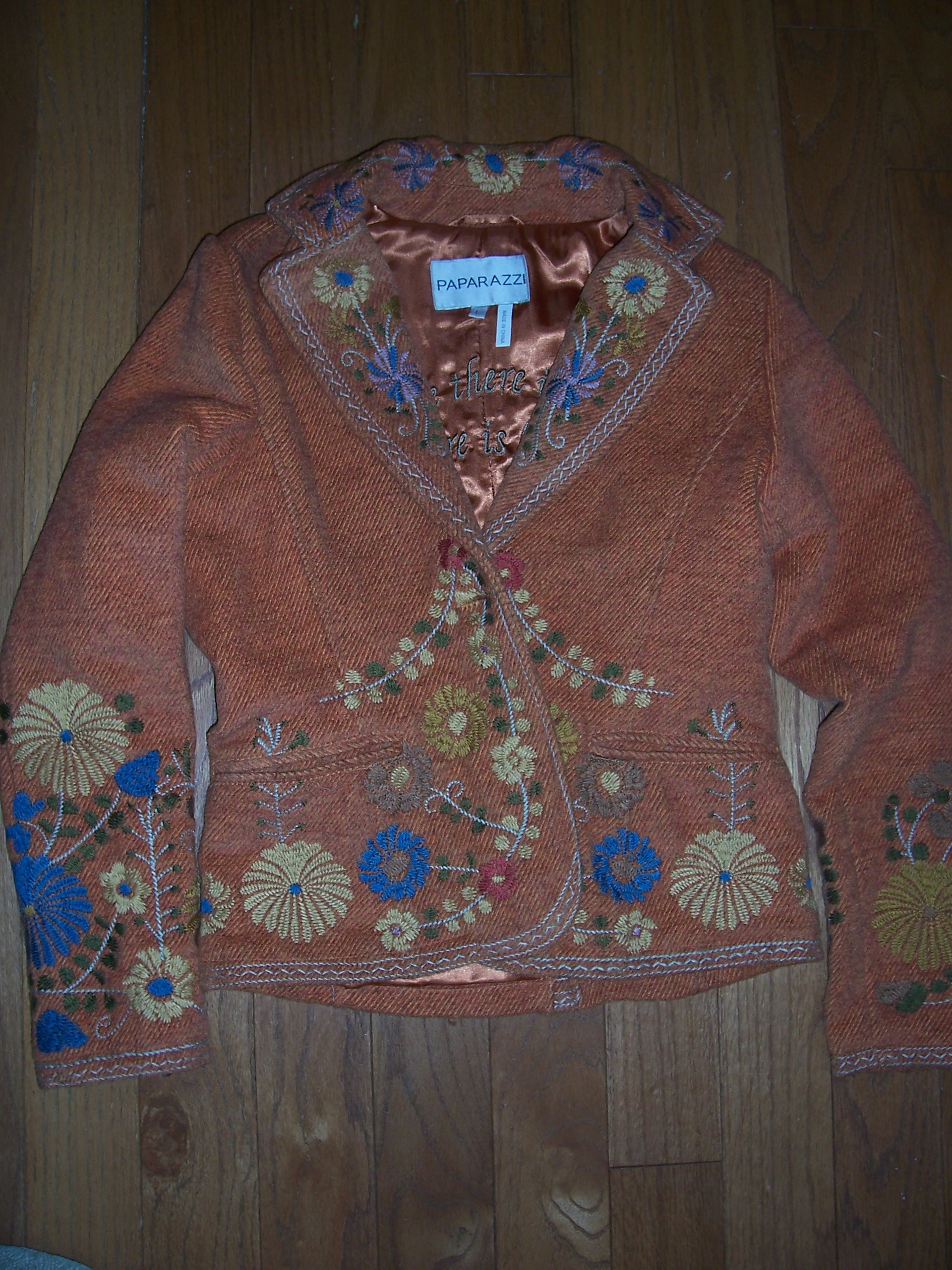 dreaded middle-age pooch that persists in hanging around no matter how many crunches I do or chocolate-covered creme-filled Krispy Kremes I give up. Since my usual cold-weather outfit is a simple and lazy turtleneck with jeans, jackets jazz things up and help me look less basic. Shop for great jacket deals in the early spring as retailers get rid of their winter stock. That’s how I got these three great finds. One of my favorites is the orange embroidered wool. As soon as the temperature gets down to the 50s and 60s, I pull it out. I wear it so much I’m sure everybody gets sick of seeing it. But I