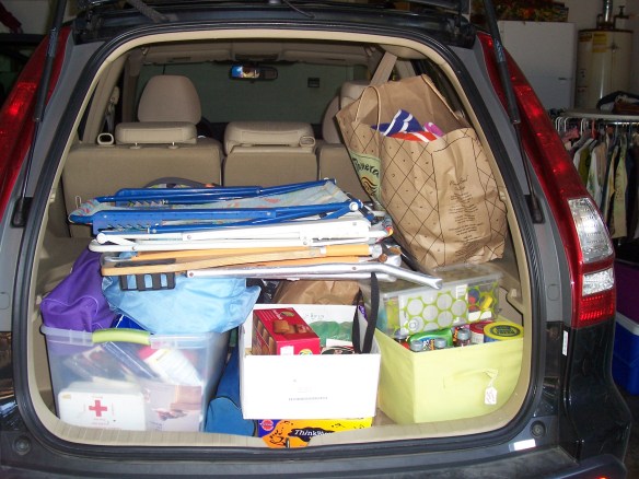 This looks like we had our car all packed up and ready for family vacation, doesn’t it? And we did … although we really hadn’t started packing yet. Fourteen folks in my family were headed to the beach in various cars and at various times and turned out Dear Husband and I had the fewest people and the most room in our car. So of course when we were all in the pre-packing stage, I told everybody, “Sure, we’ll take those chairs/boxes/bags for you if you don’t have room. No problem.” I was happy to help out and it wasn’t a problem — until I realized I’d almost offered out all available space and left only a few square inches for Husband’s and my bags. But some creative shifting freed up the necessary room. And, as usual, I overpacked, anyway. Anytime I’m lucky enough to go to the beach, I end up being totally minimalist and pulling on whatever’s easiest — T-shirts and shorts over swimsuits most of the time — and not even caring if I’m wearing the correct white top-with-black-capris combo accented with appropriate jewelry and handbags I usually do during Real Life. (Hey, I’m a Southern girl. Appropriate handbags are in our DNA, you know.) Sadly, I forget that and always persist in carefully packing coordinated outfits that end up unworn in favor of the wrinkled three-days-in-a-row tank top. And I bet there are lots of you all who suffer from Vacation Overpacking Disorder, too. We should band together and start a support group. And of course the only cure for our afflication is — more vacation packing! Who’s with me???