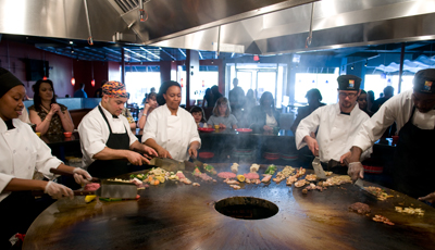 build in a bowl as high as you wish. Of course, we five experienced moms sort of cringed at the thought of adding raw meat to a pile of vegetables and letting it set for a few minutes, but our waitress assured us it would be OK, and of course it was. The really fun part, though, is figuring our your sauce. There are about 1o or 12 to choose from, with flavors such as Cajun, Asian and Southwestern. I really liked the Roasted Garlic with Honey and then a pineapple-ginger one. You can stick with one or mix some together. So you put your sauce in little cups and take your bowl of ingredients plus your sauce over to the grill, where the cooks deftly arrange your ingredients in a line, do their magic, add your sauce and in a few minutes you’ve got a hot and yummy personalized stir fry. You can take your drinks to the grill while you watch and go back as often as you like. It was lots of fun, but it can be a little intimidating if you feel pressured by the thought that a good meal is up to your own skill at combining ingredients. After all, relying on somebody else’s expertise is one of the reasons we go out to eat. But there are no bad choices, and the sauce redeems all. If you’re uneasy at first, start out small with only a few ingredients — although if it’s crowded and there’s a line at the grill, this approach might slow down your evening. And if you don’t want a stir fry at all, do a hamburger or veggie burger at the grill and get a big basket of fries to go with. Yum! The salad/entree bar is $15.95 for dinner and $9.9 for lunch. There are also appetizers and a dessert, including a fondue for more do-it-yourself eating, but these are extra. As long as you’ve got folks along who are willing to try something new, this is a great place. It’s also good for families like mine, where everybody likes different things. According to the Web site, http://www.fire-ice.com/, Fire and Ice is a chain that started in 1997 in Cambridge, Mass., and now is all over the world. It’s fun and different, so try it.
