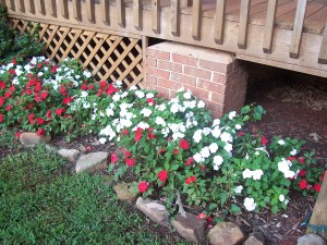 make me happy every time I look at them. The “flowers” (and I use that term loosely) on the right are spindly and leggy and not doing well at all and make me cringe every time I have to look their way. So guess which flowers are smack dab in the front yard for all the world to see and which ones are hidden in a corner of the backyard where nobody goes? This is why I’m a weeder, not a gardener.