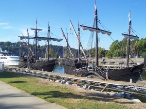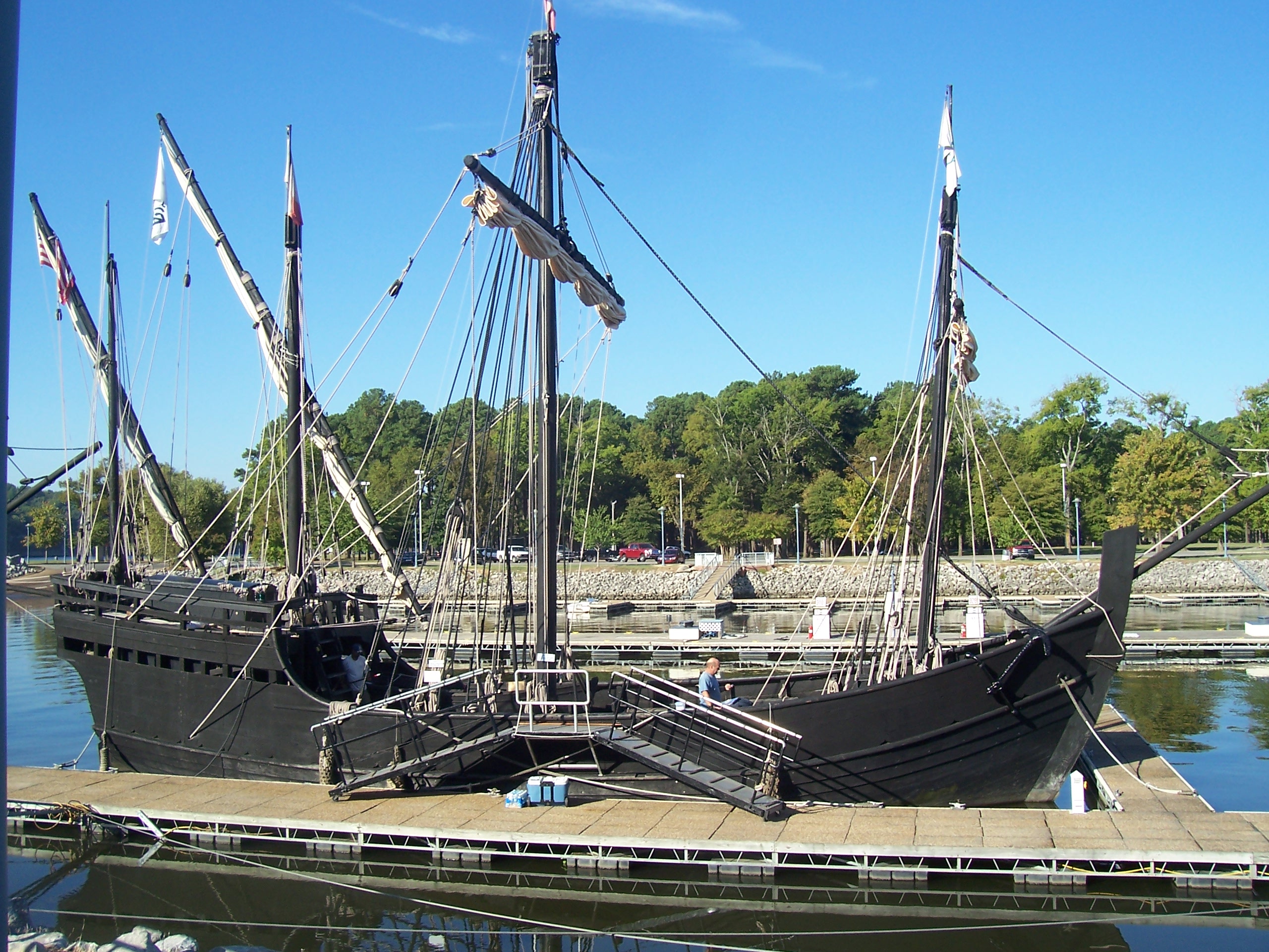 local marina and seeing 15th-century masts towering over the more-usual fishing boats or stepping onto one of these replica ships and realizing that people actually crossed a big scary ocean and lived for months in something smaller than most people’s closets. Well, the closets of really rich people, anyway. But, still. These replicas of Christopher Columbus‘s Nina and Pinta are tiny, tiny, tiny. See the guy to the right of the center in the photo on the left? He practically can touch both sides of his ship when he stands in the middle and stretches out his arms. Truly. Built with hand tools in Brazil and owned by a British charity in the British Virgin Islands, these ships are making their way along the Mississippi and Tennessee rivers. When they dock in local harbors, the captain and his volunteer crew open the ships for tours. They’re here in Florence, Alabama, through Monday. Come take a look. You’ll be amazed. These ships come to my town every few years or so. They previously were here in 2003, and I remember because they were at the marina when my now-husband officially asked me to marry him … on a day that happened to be Columbus Day. And why that strikes me as funny — that I got engaged on Columbus Day — I have no idea. Help!!!