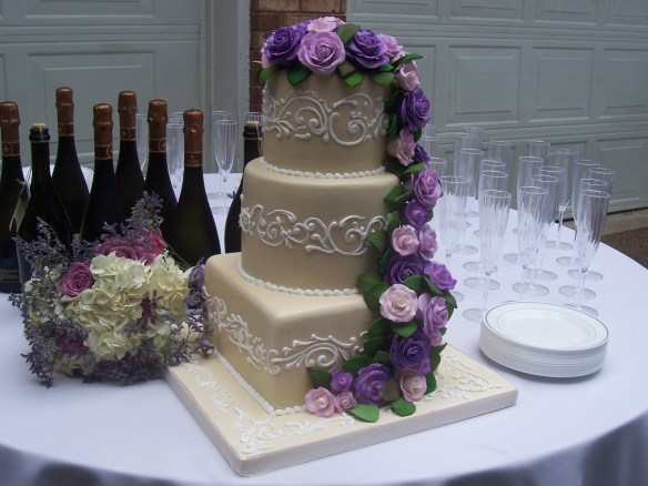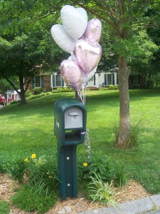 the outdoor reception, which was fantastic. We’d spent Wedding Eve in their kitchen, drinking wine and eating pizza and I was amazed at the couple’s calm — if I were having 65 people over to my house the next day I think I’d be bouncing off the walls. But Ted and Elayne are those kind of low-keyed folks who believe that everything will turn out OK, and they were right. It did. Even the threat of rain — which tends to make Nashvillians extra nervous these post-flood days — didn’t matter. We sat under a tent and talked and drank and dined on the fantastic reception menu that Ted had created: Bacon-wrapped shrimp, little sandwiches of Canadian bacon and fried green tomatoes, smoked salmon and bruschetta with excellent pesto were my favorites. And the cake! Oh, that cake!!! I’ve had some marvelous wedding cake at some great weddings, but I’m telling you this was the best. Ever. It was a rich and moist yellow buttercream and white-chocolate fondant and raspberry filling. It was gorgeous inside and out, and those flowers decorating it were rolled fondant. Beautiful! And dear husband and I had a part, too. We begged Ted to let us do something to help and feel useful, so our assignment on wedding day was to decorate their mailbox with balloons. Honestly, I was afraid that metallic lavender (OK, they actually are pink but the color theme was lavender so that’s what we’re calling it here) and white hearts might be a bit much, but Ted said it was “spectacular” and everybody said they looked good. Mainly, they said that when I asked them, but I’ll take it. So now I believe that Dear Husband and I could go into the mailbox-decorating business. Call us.
